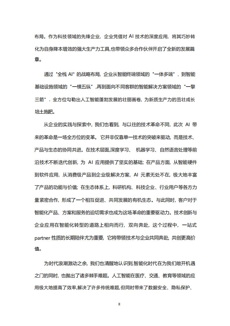 展望 2025 年, AI 无疑仍将是科技领域最受瞩目的焦点。在激烈的市场竞争中, 各公司逐渐找准自身定位, 差异化和竞争的等级秩序已然形成。科技巨头凭借强大的研发实力布局 AI 基础研究 各企业扎根行业应用,深挖细分市场的潜力; 备受期待的 "杀手级" AI 应用已进入倒计时, 随时可能掀起新一轮的科技与商业革命;全球范围内, 人工智能标准也在持续健全, 从数据安全保护到算法公平性规范,全方位为 AI 的稳健前行保驾护航。未来, 人类走向 AGI (通用人工智能) 的步伐将愈发沉稳有序。而当下, 聚焦 AI 从通用到有用的转型, 是开启未来无限可能的关键钥匙, 让 AI 真正赋能商业, 点亮生活。