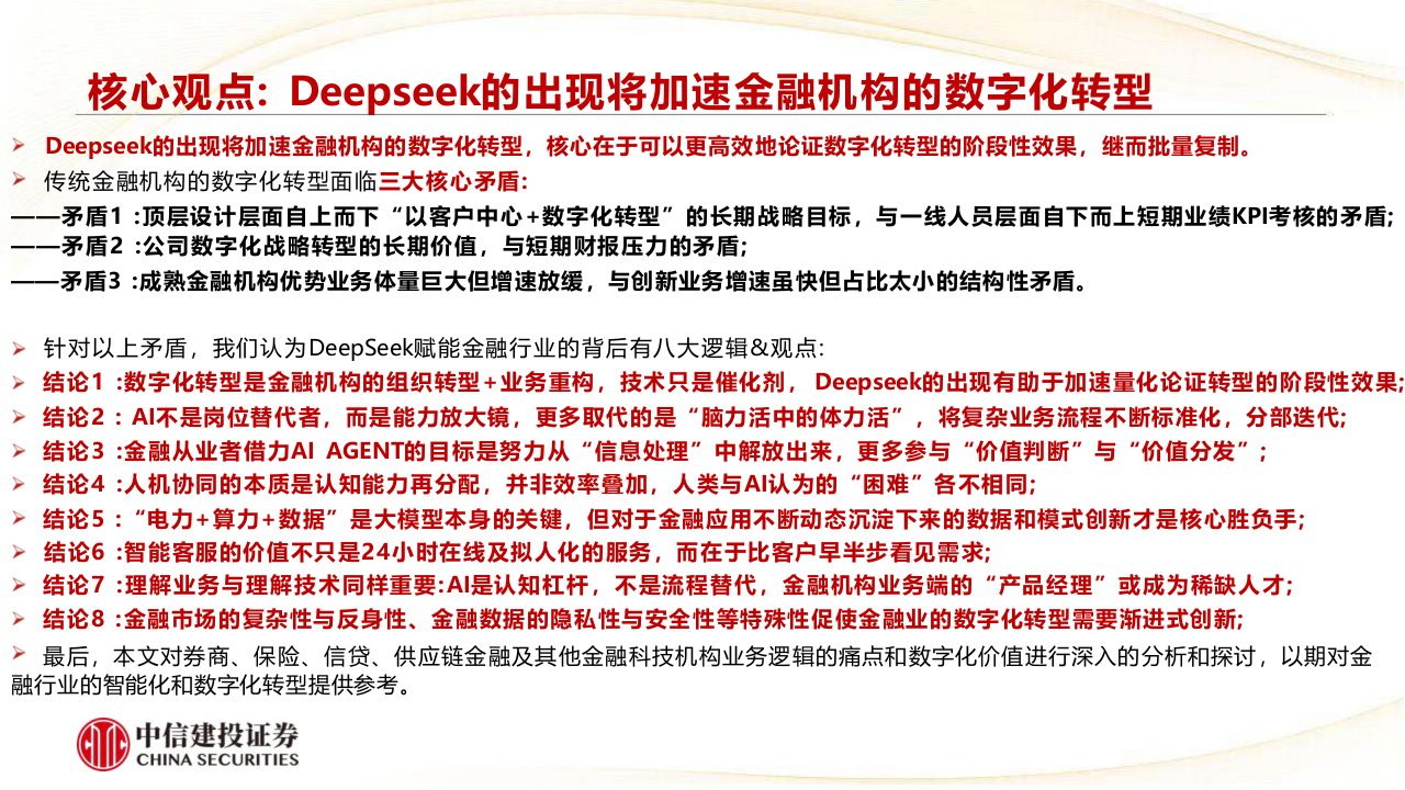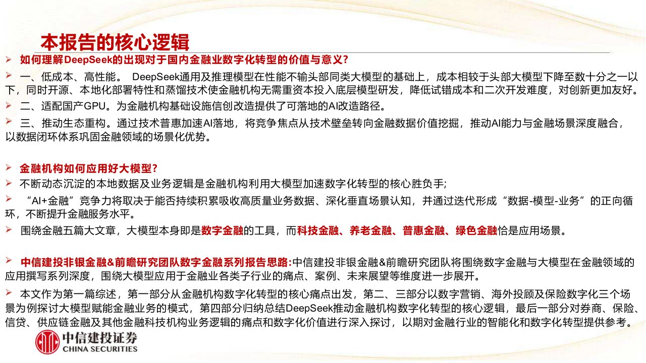第一部分从金融机构数字化转型的核心痛点出发,第二、三部分以数字营销、海外投顾及保险数字化三个场 景为例探讨大模型赋能金融业务的模式,第四部分归纳总结DeepSeek推动金融机构数字化转型的核心逻辑,最后一部分对券商、保险、 信贷、供应链金融及其他金融科技机构业务逻辑的痛点和数字化价值进行深入探讨,以期对金融行业的智能化和数字化转型提供参考。