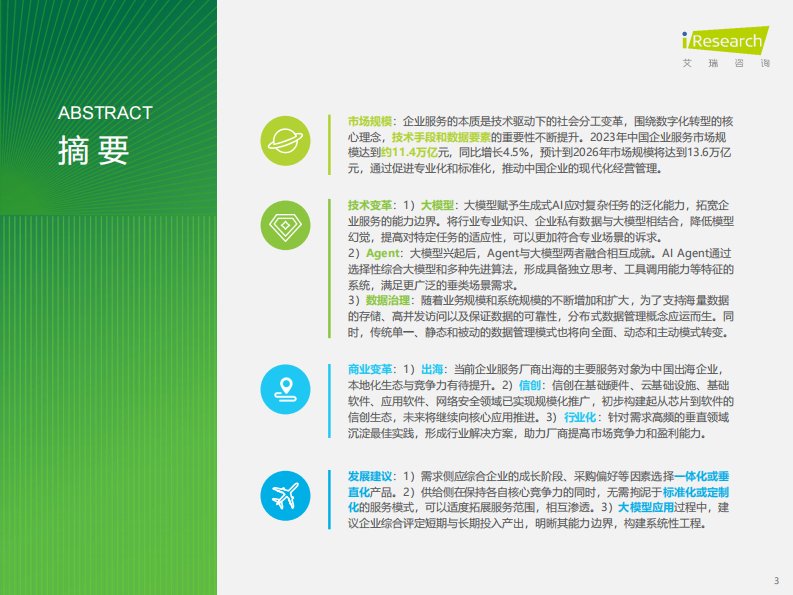 企业服务的本质是技术驱动下的社会分工变革,围绕数字化转型的核心理念,技术手段和数据要素的重要性不断提升。2023年中国企业服务市场规模达到约11.4万亿元,同比增长4.5%,预计到2026年市场规模将达到13.6万亿元,通过促进专业化、标准化,推动中国企业的现代化经营管理。本报告重点对近两年企业服务在技术侧和商业侧的变革展开分析,探讨大模型、Agent、数据治理及出海、信创、行业化等发展趋势。希望帮助企业服务厂商把握未来发展的关键机遇,同时为企业客户应用新技术、新理念推动转型升级提供可供参考的建议。