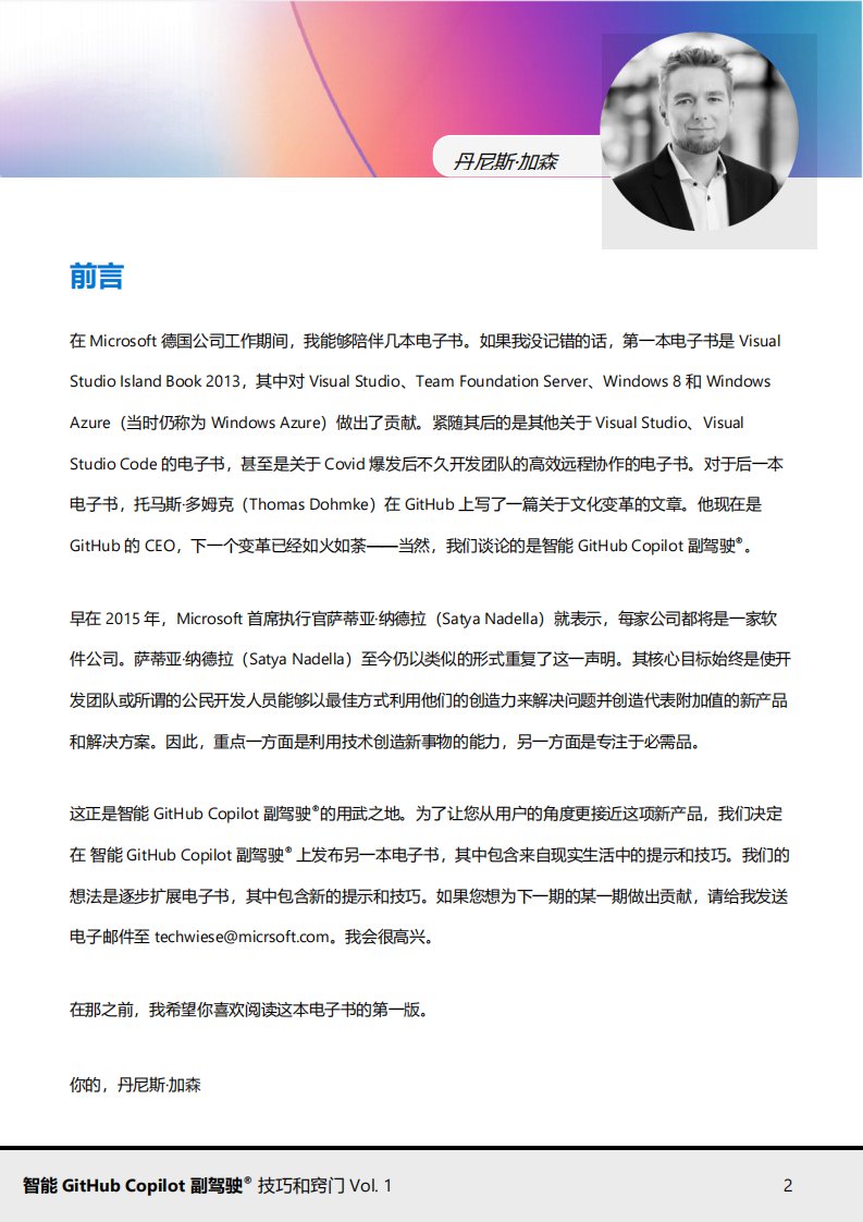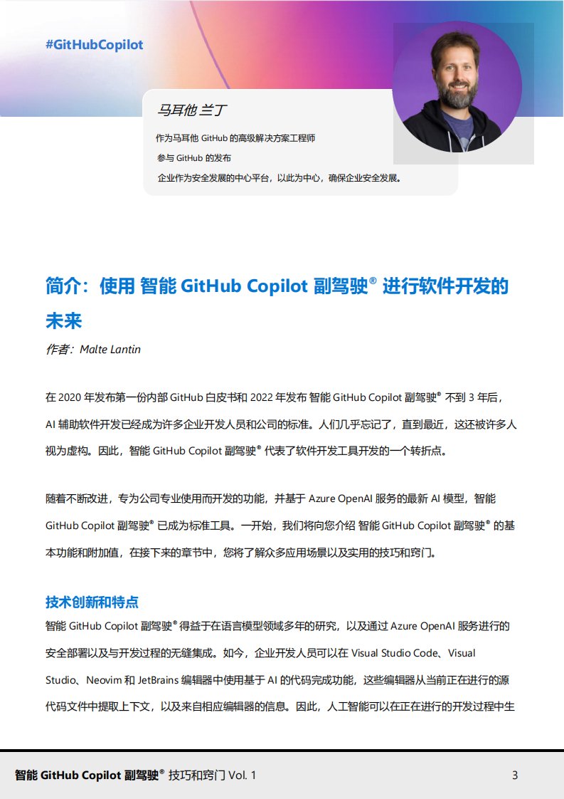该电子书介绍了智能GitHub Copilot副驾驶®如何帮助开发者以更智能、更高效的方式编写代码。它解释了这个工具如何理解开发者的需求,提供实时的代码建议,以及如何通过聊天功能简化复杂的编程任务。书中还探讨了企业版如何为特定需求定制AI模型,提高开发安全性和个性化。