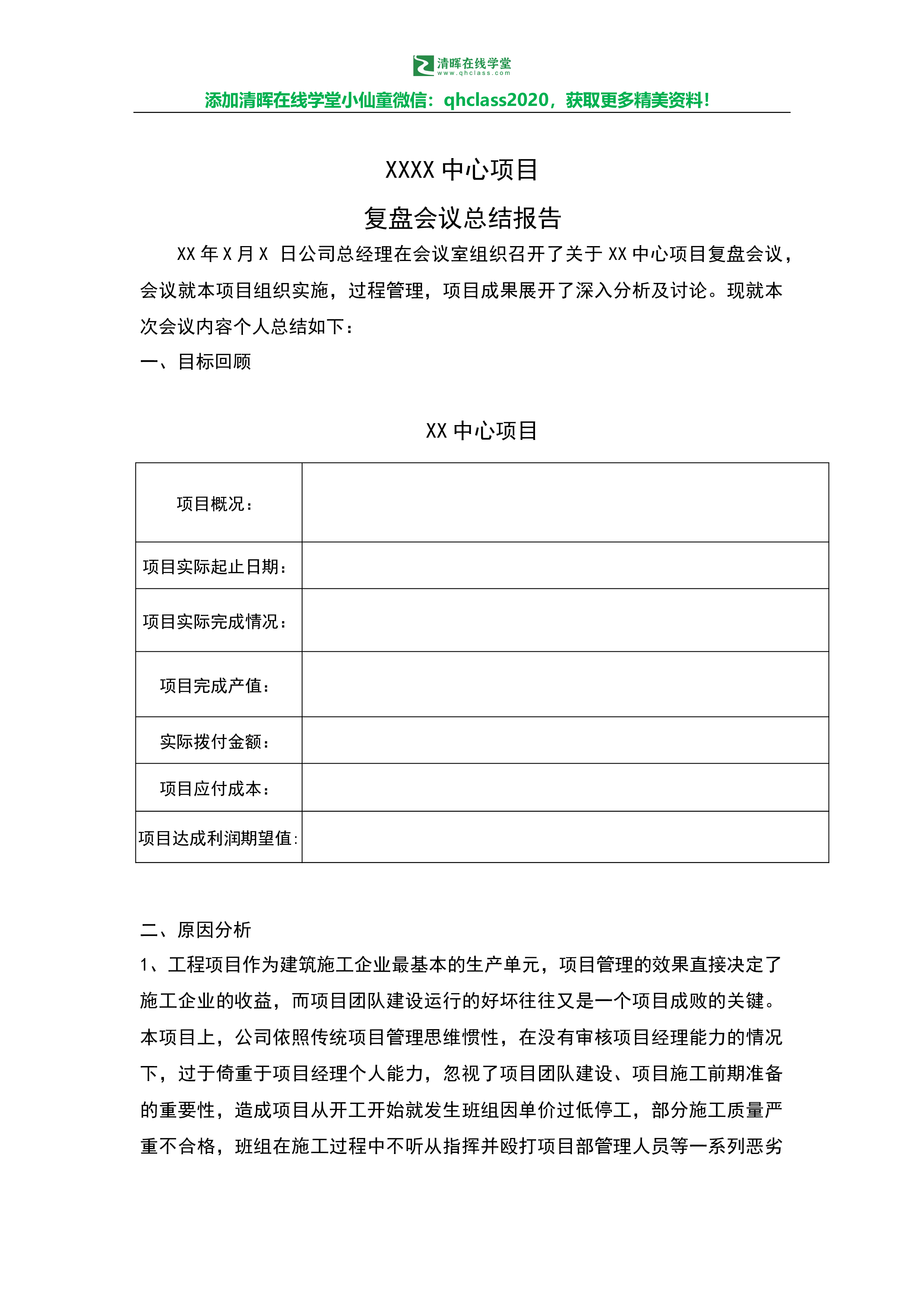 添加清晖在线学堂小仙童微信:qhclass2020,获取更多精美资料!XXXX中心项目复盘会议总结报告XX年X月X日公司总经理在会议室组织召开了关于XX中心项目复盘会议,会议就本项目组织实施,过程管理,项目成果展开了深入分析及讨论。现就本次会议内容个人总结如下:一、目标回顾二、原因分析1、工程项目作为建筑施工企业最基本的生产单元,项目管理的效果直接决定了施工企业的收益,而项目团队建设运行的好坏往往又是一个项目成败的关键。本项目上,公司依照传统项目管理思维惯性,在没有审核项目经理能力的情况下,过于倚重于项目经理个人能力,忽视了项目团队建设、项目施工前期准备的重要性,造成项目从开工开始就发生班组因...