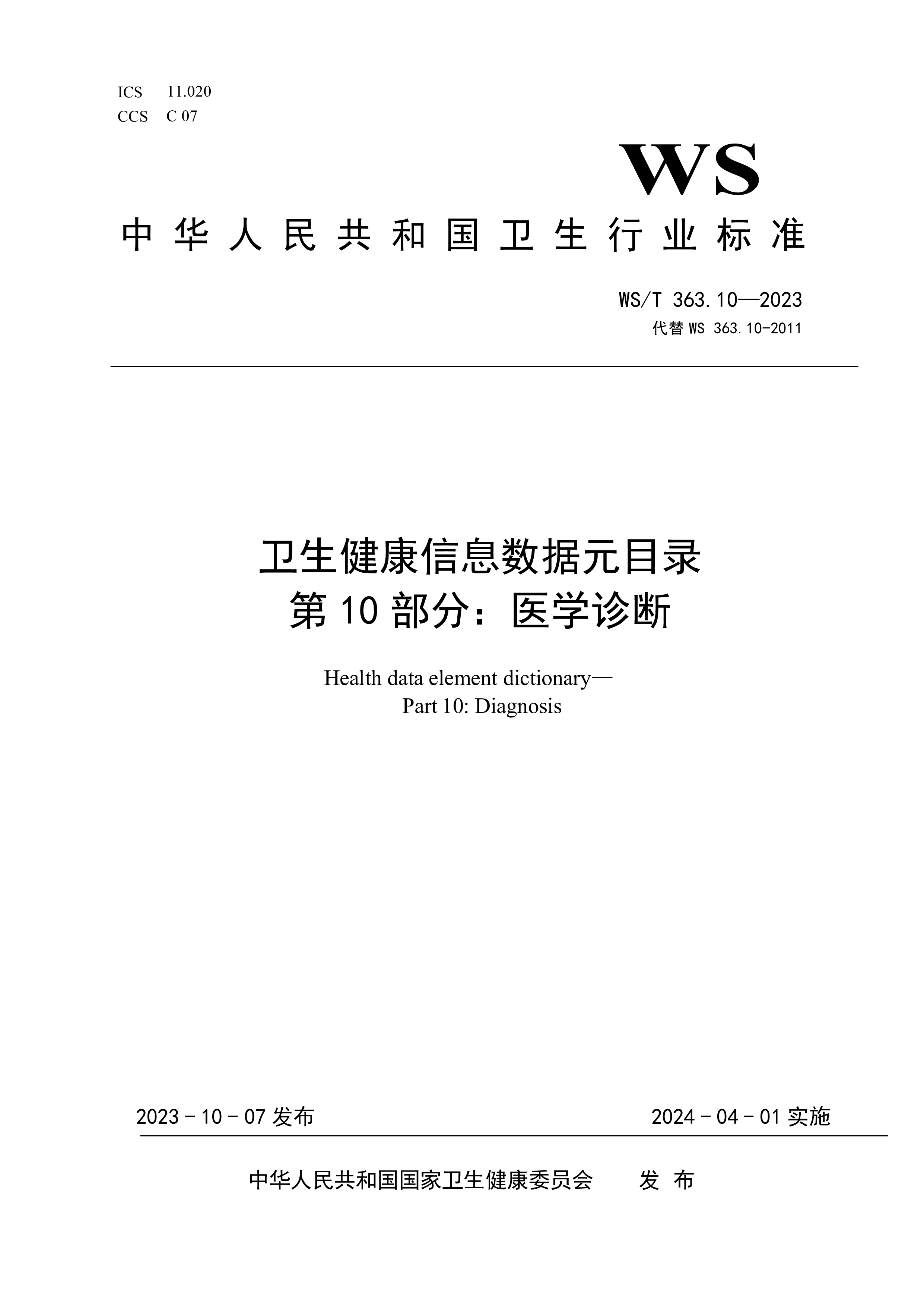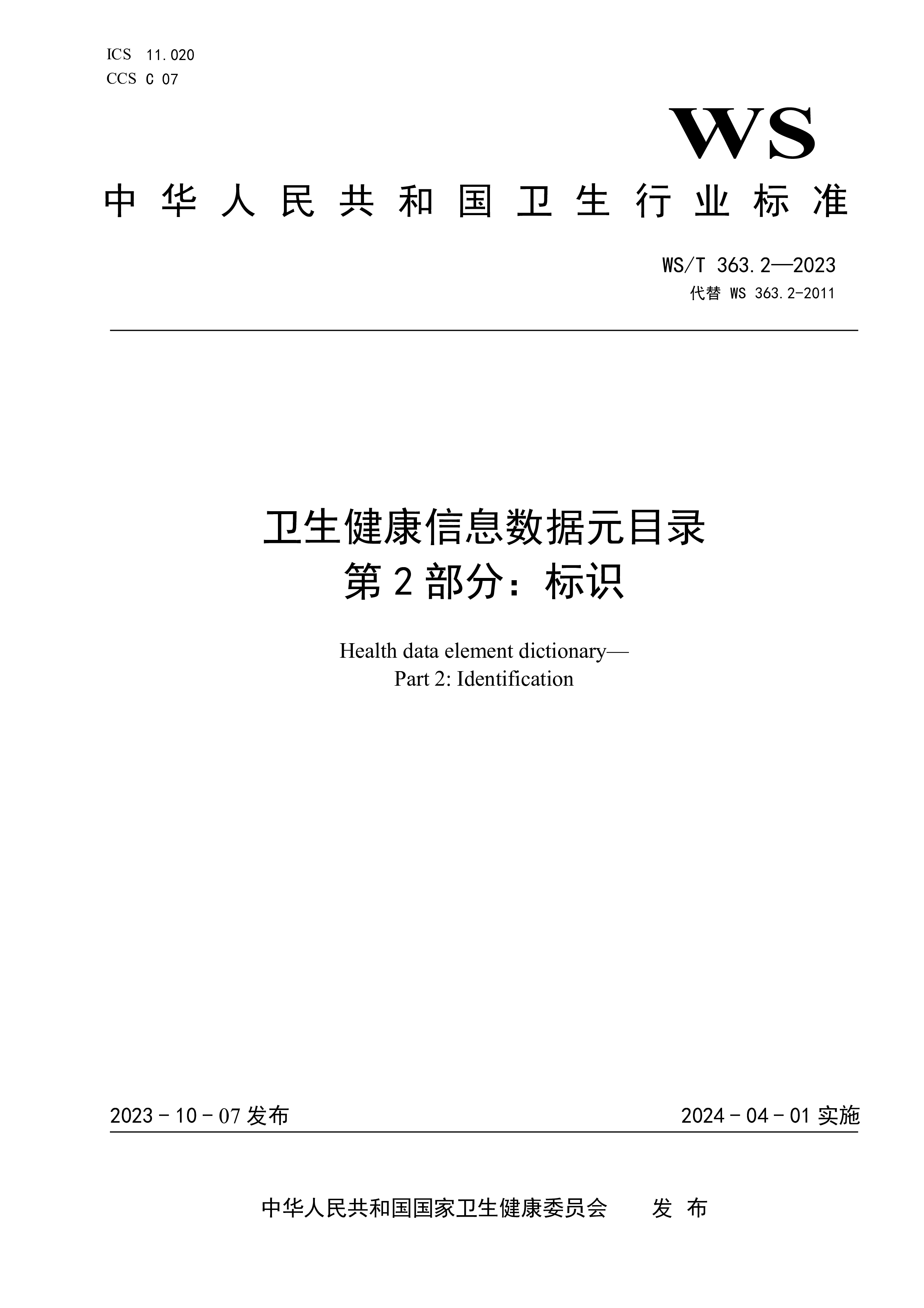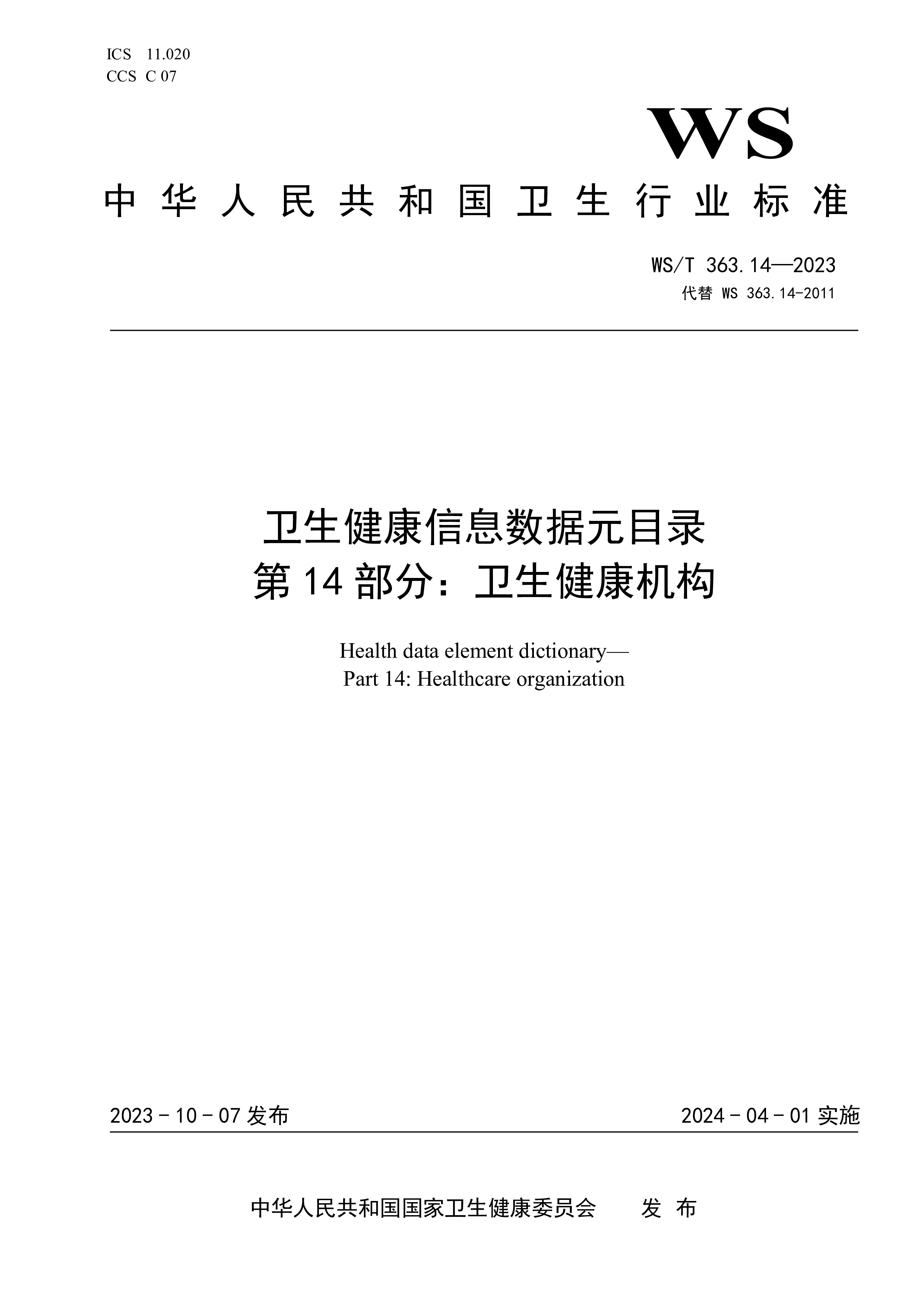ICS11.020CCSC07WS中华人民共和国卫生行业标准WS/T363.14—2023代替WS363.14-2011卫生健康信息数据元目录第14部分:卫生健康机构Healthdataelementdictionary—Part14:Healthcareorganization2023-10-07发布2024-04-01实施中华人民共和国国家卫生健康委员会 发布WS/T363.14—2023I前言本标准为推荐性标准。本标准是WS/T363—2023《卫生健康信息数据元目录》的第14部分。WS/T363—2023已经发布了以下部分:——第1部分:总则——第2部分:标识——第3部分:人口学及社...