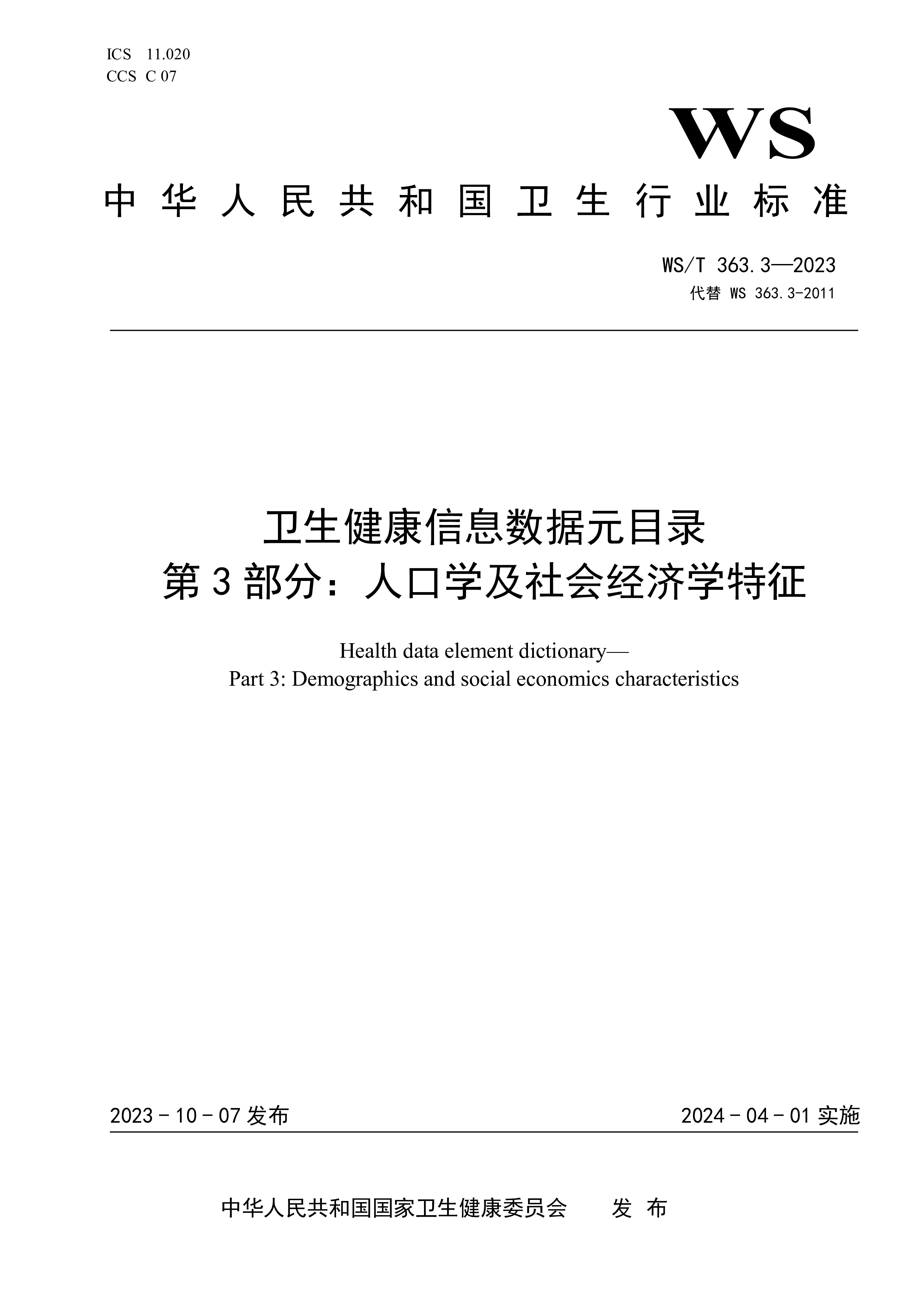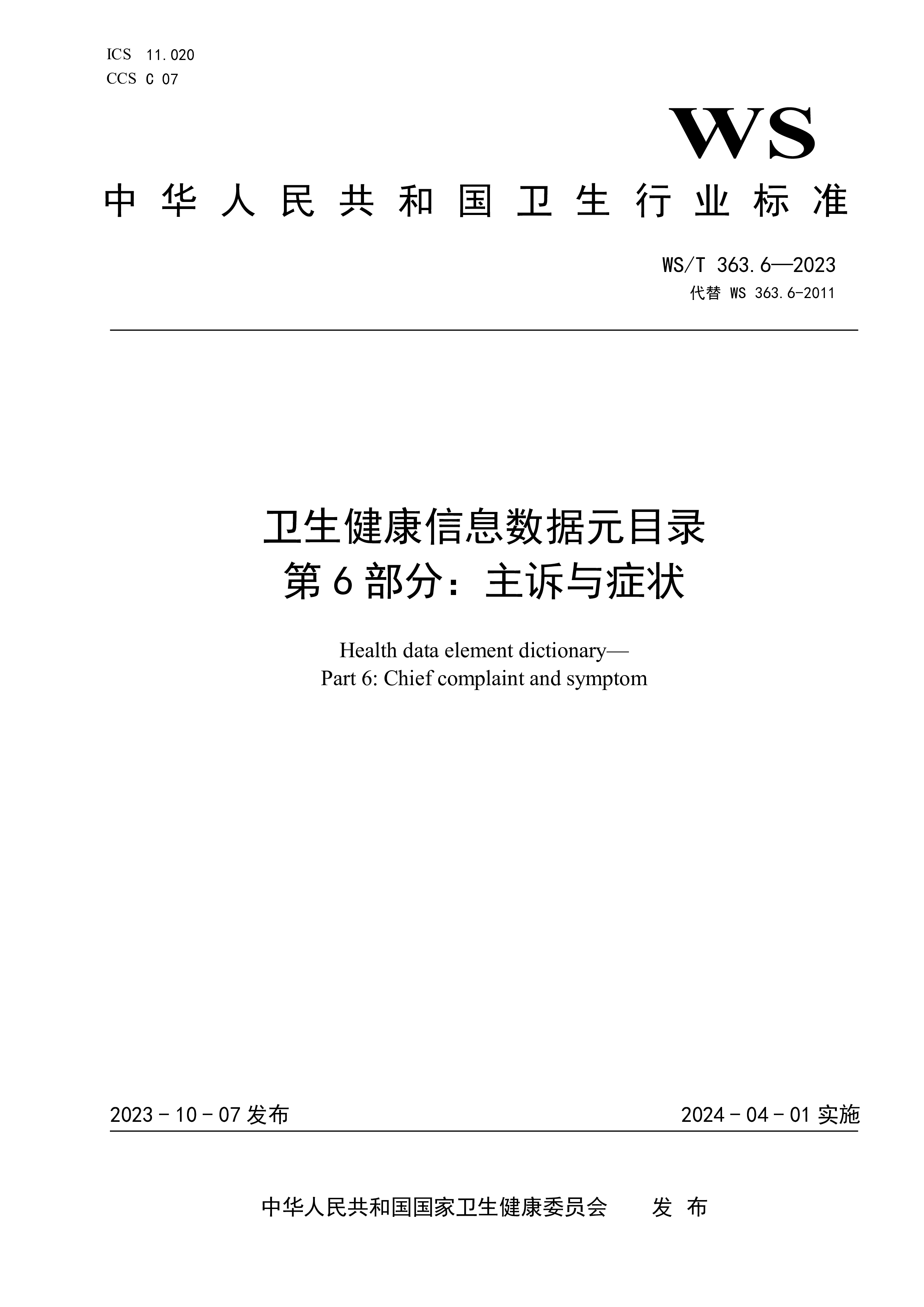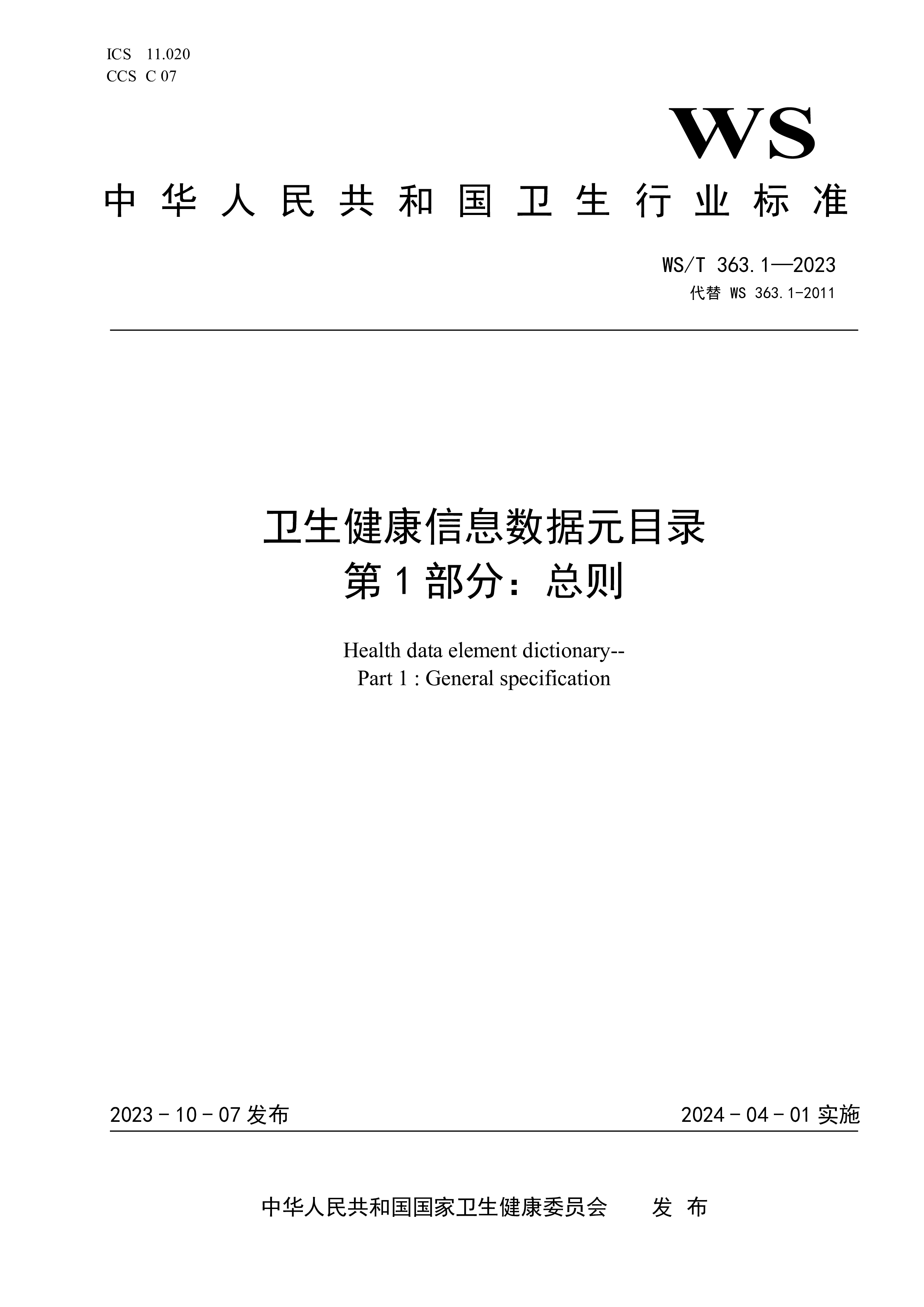 ICS11.020CCSC07WS中华人民共和国卫生行业标准WS/T363.14—2023代替WS363.14-2011卫生健康信息数据元目录第14部分:卫生健康机构Healthdataelementdictionary—Part14:Healthcareorganization2023-10-07发布2024-04-01实施中华人民共和国国家卫生健康委员会 发布WS/T363.14—2023I前言本标准为推荐性标准。本标准是WS/T363—2023《卫生健康信息数据元目录》的第14部分。WS/T363—2023已经发布了以下部分:——第1部分:总则——第2部分:标识——第3部分:人口学及社...