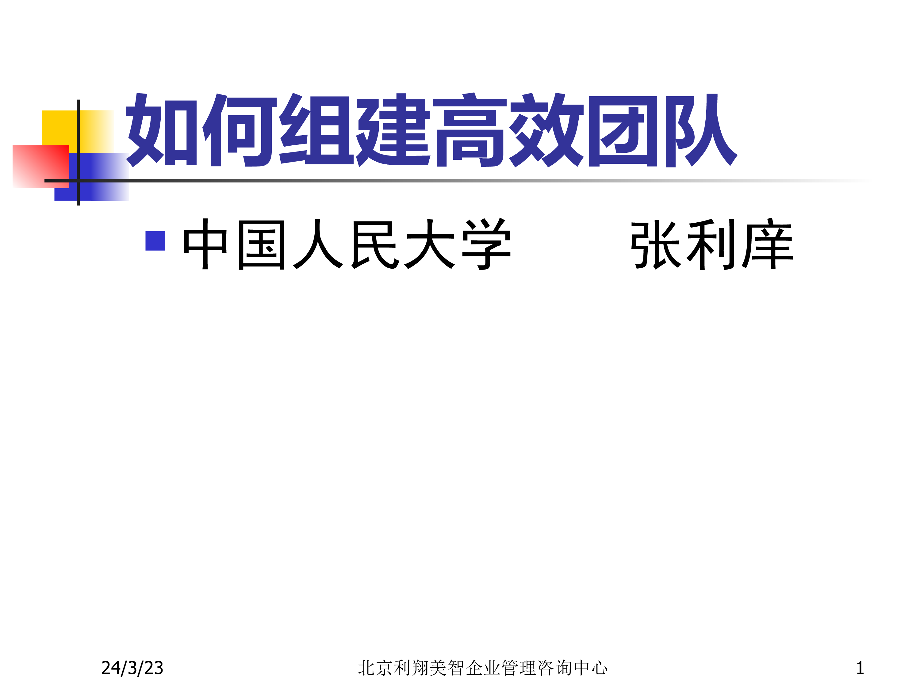 24/3/23北京利翔美智企业管理咨询中心1如何组建高效团队中国人民大学张利庠24/3/23北京利翔美智企业管理咨询中心2本讲座主要内容:1、目标:销售团队的基本内容和作用2、招聘:营销人员的招聘3、激励方法:营销团队的“多元立体”七大激励4、考核管理:营销团队的考核魔方5、工具:营销团队考核政策与量表“案例”6、思路:营销团队的建设办法7、风险意识与成本意识8、交流24/3/23北京利翔美智企业管理咨询中心3一、销售团队的素质和作用1、什么是销售团队?WorkteamOrTeamworking在现代市场营销中,没有完美的个人,只有完美的团队!是指为了实现营销可持续性发...
