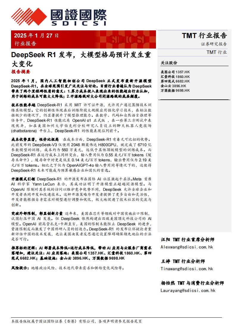 TMT 行业报告 DeepSeek R1 发布,大